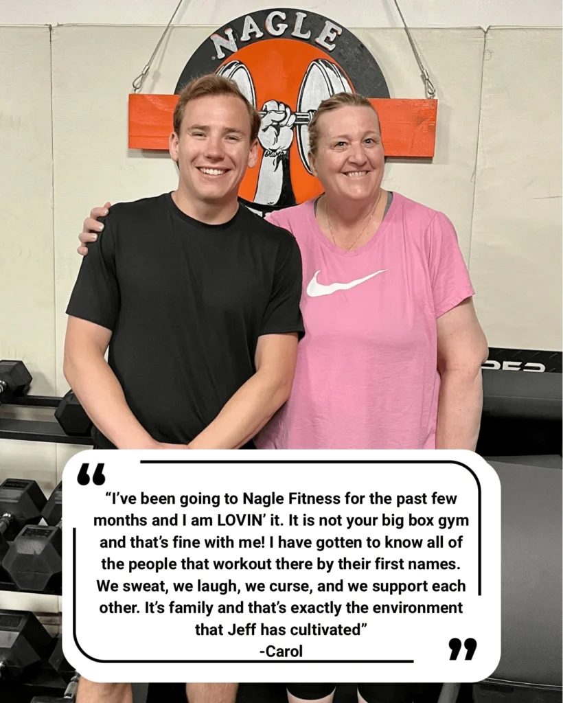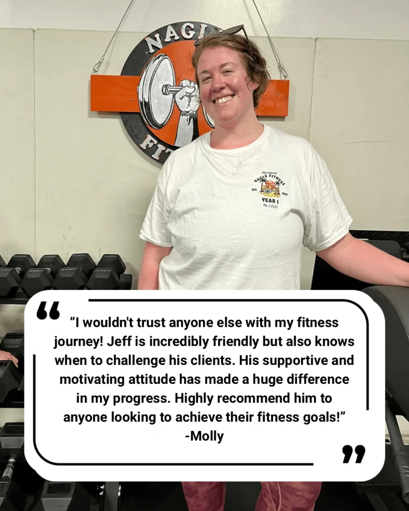 Nagle Fitness is a special place that promotes individual goals for long term health and wellness. Jeff is so knowledgeable and develops workouts to compliment my strengths and also challenge me to work on areas that need improvement. The gym space is clean and open and there is a great vibe among the clientele. Jeff is always there during the workout for training support, form correction and equipment help. Highly recommend this family run local business!!!!